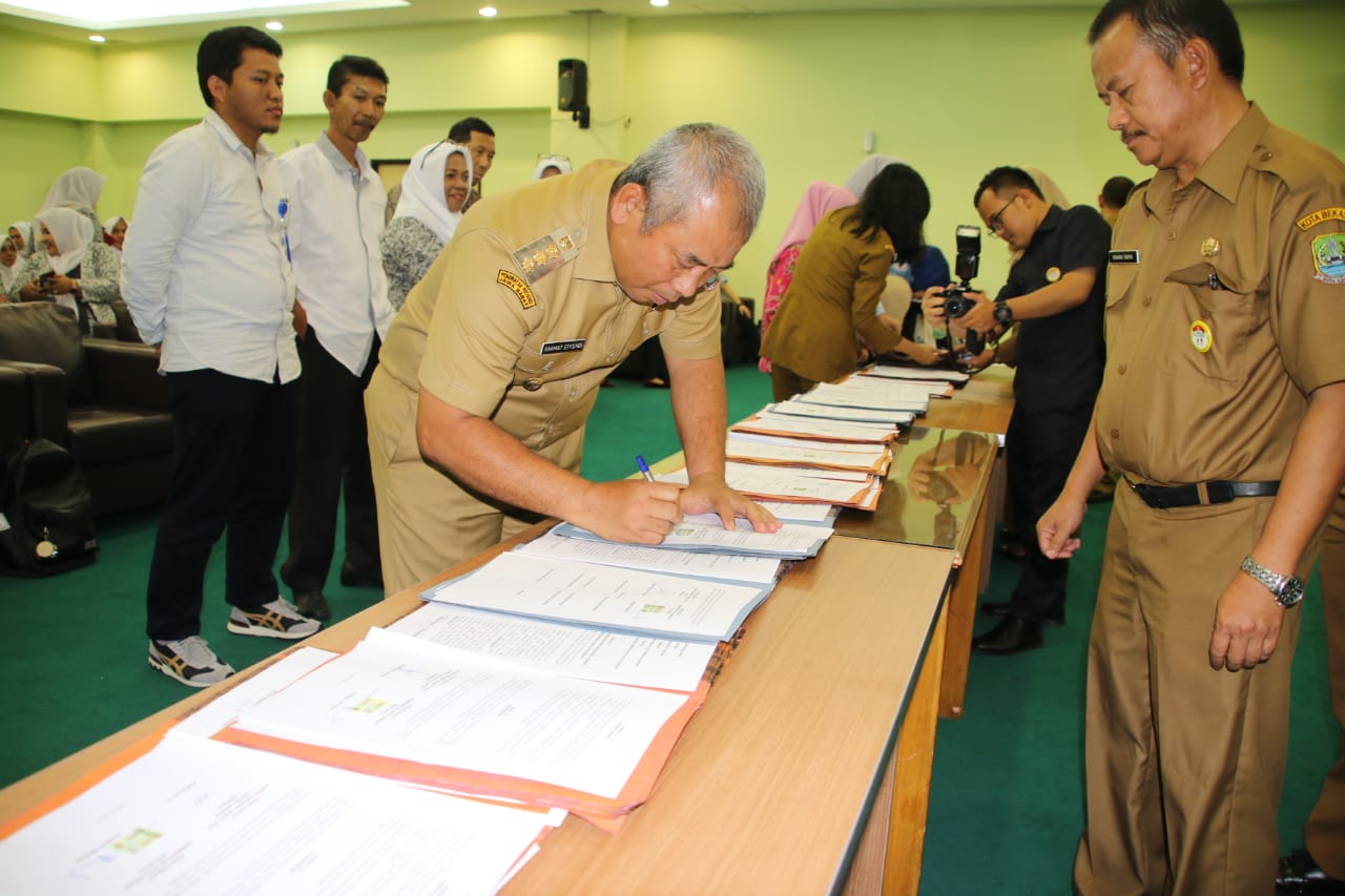 Wali Kota Bekasi, Rahmat Effendi menandatangani MoU Jaminan Kelahiran warga Kota Bekasi didampingi Kepala Dinas Kesehatan, Tanti Rohilawaty, Kepala BPKAD, Supandi Budiman, Asisten Daerah II, Kariman, Kepala Bagian Kerjasama, Hanan Tarya, dan Kepala Bagian Hukum, Wahyudin.