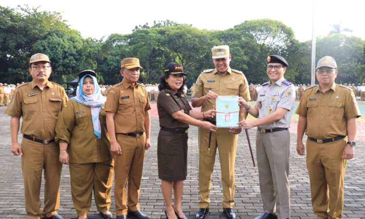 PILAR BEKASI.COM (KOTA BEKASI) – Apel pagi yang menjadi rutinitas pada Senin hari ini terdapat rangkaian yakni penyerahan sertifikat aset milik Pemerintah Kota Bekasi. hadir Kepala Pertanahan Kota Bekasi Amir Sofwan bersama Kepala Kejaksaan Negeri Kota Bekasi Laksmi untuk secara bersama menyerahkan kepada Pelaksana Tugas (Plt.) Wali Kota Bekasi, Tri Adhianto.