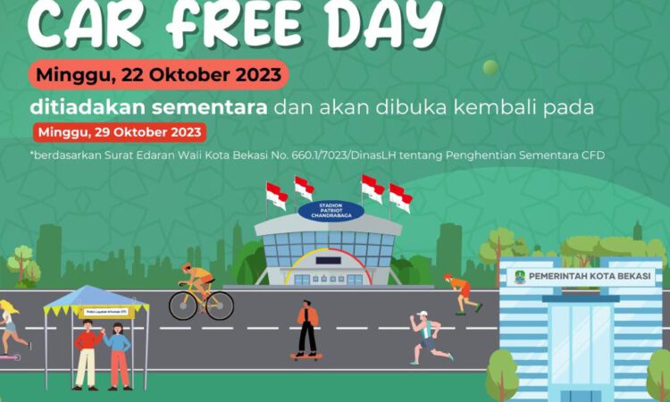 PILAR BEKASI.COM (KOTA BEKASI) –Pemerintah Kota Bekasi melalui Dinas Lingkungan Hidup meniadakan sementara Hari Bebas Kendaraan Bermotor (Car Free Day) tanggal 22 Oktober 2023 dan akan dimulai kembali tanggal 29 Oktober 2023 dikarenakan bertepatan dengan pelaksanaan kegiatan peringatan hari santri nasional tingkat Kota Bekasi.