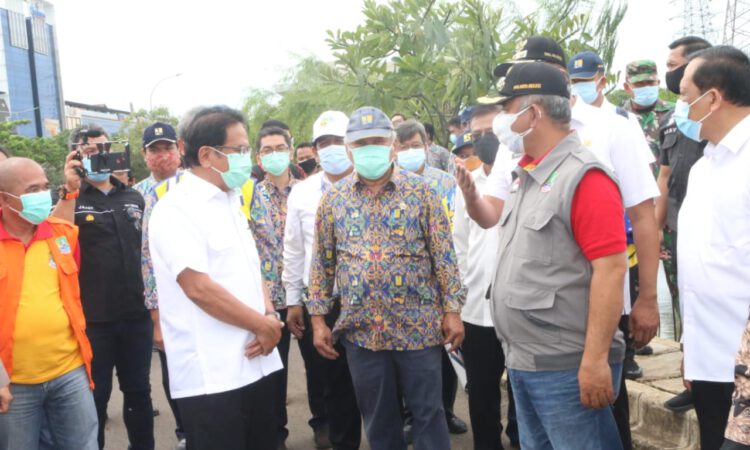 PILAR BEKASI.COM (BEKASI SELATAN) – Menteri Agraria dan Tata Ruang/Badan Pertanahan Nasional (ATR/BPN) RI, Dr Sofyan Djalil dan Menteri Pekerjaan Umum dan Perumahan Rakyat (PUPR) RI, Ir. Mochamad Basoeki Hadimoeljono melakukan peninjauan lapangan di Kota Bekasi terkait program penyelesaian banjir Jabodetabek, pada Rabu, (27/1/2021).