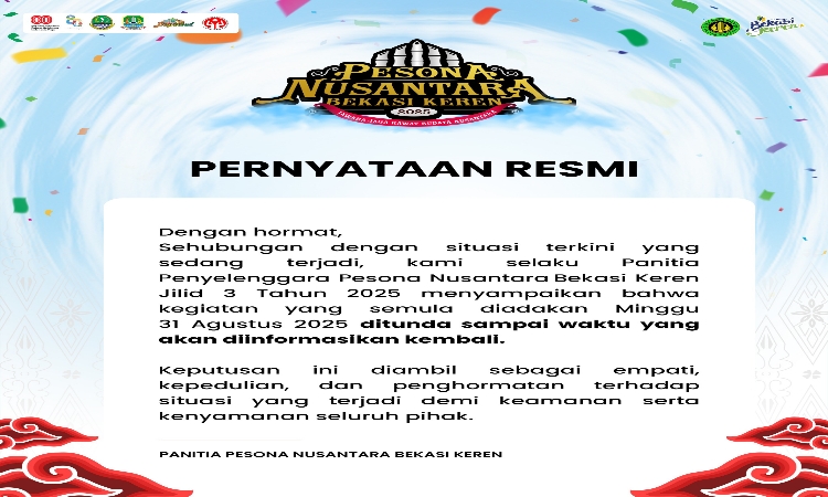 Pemerintah Kota Bekasi memastikan akan terus mendukung pelestarian budaya dan memberikan ruang bagi kreativitas masyarakat. Jadwal baru kegiatan Pesona Nusantara Bekasi Keren 2025 akan diumumkan segera setelah kondisi dinyatakan aman untuk penyelenggaraan acara.(ASW)