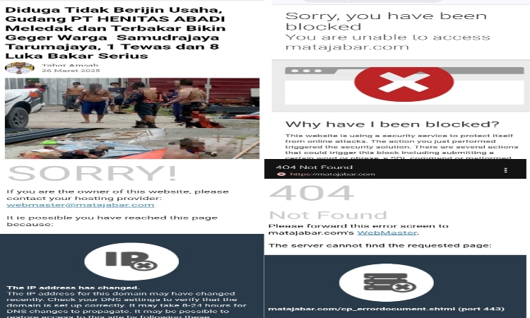 PILAR BEKASI. COM (BEKASI) – Situs berita MATAJABAR.COM mengalami serangan siber (web attack) setelah menerima ancaman dari seseorang yang mengaku bernama Andri, terkait permintaan penghapusan (take down) artikel pemberitaan mengenai peristiwa ledakan di gudang atau workshop yang diduga dikontrak PT Henitas Abadi, yang menewaskan satu pekerja dan melukai delapan lainnya dengan luka bakar serius.
