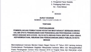 PILAR BEKASI.COM (BEKASI SELATAN) – Komite Kebijakan Penanganan Corona Virus Disease (Covid-19) dan Transformasi Pemulihan Ekonomi Kota Bekasi mengeluarkan surat edaran nomor: 556/513/SET.Covid-19 tentang Pemberlakuan Pembatasan Kegiatan Masyarakat Berbasis Mikro Dalam Upaya Penanganan dan Pengendalian Penyebaran Corona Virus Disease 2019 (Covid-19) di Kota Bekasi pada Sektor Jasa Usaha Kepariwisataan, Hiburan dan Perdagangan (Area Publik) di Kota Bekasi.
