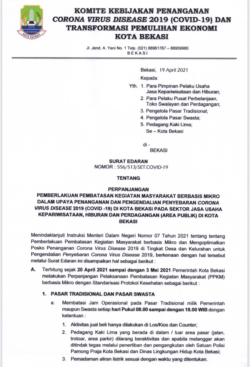 Surat edaran tersebut berlaku terhitung sejak 20 April 2021 sampai dengan 03 Mei 2021 dan ditujukan untuk para pimpinan pelaku usaha jasa kepariwisataan dan hiburan, pelaku usaha pusat perbalanjaan toko swalayan dan perdagangan, pengelola pasar tradisional, pengelola pasar swasta serta pedagang kaki lima se-Kota Bekasi berisikan tentang :
