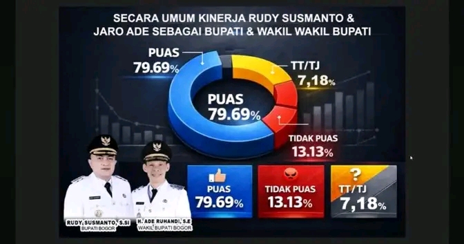 PILAR BEKASI.COM (KAB.BOGOR) – Memasuki satu tahun masa kepemimpinan Bupati Bogor, Rudy Susmanto dan Wakil Bupati H. Ade Ruhandi, Pemerintah Kabupaten (Pemda) Bogor menerima rapor positif dari masyarakat. Berdasarkan data survei kepuasan publik terbaru dari lembaga visi nusan, rata-rata indeks kepuasan masyarakat terhadap kinerja Pemda Bogor mencapai angka signifikan sebesar 83,29%.