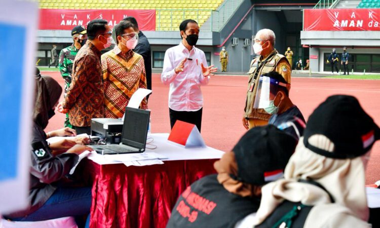 PILAR BEKASI.COM (BEKASI SELATAN) – Presiden Joko Widodo pada Senin, 14 Juni 2021,berkunjung ke Stadion Patriot Candrabhaga,Kota Bekasi, Jawa Barat, yang menjadi lokasi pelaksanaan vaksinasi massal. Selama tiga hari ke depan, sebanyak kurang lebih 4.500 orang dari kelompok warga lanjut usia (lansia), pekerja publik, difabel, hingga masyarakat umum akan mengikuti kegiatan vaksinasi tersebut.