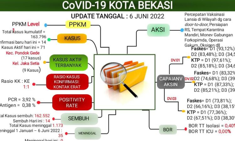 PILAR BEKASI.COM (KOTA BEKASI) – Laporan perkembangan Covid 19 Kota Bekasi, Dinas Kesehatan Kota Bekasi mengeluarkan update pertanggal 6 Juni 2022. Kota Bekasi masuk dalam PPKM Level 1.